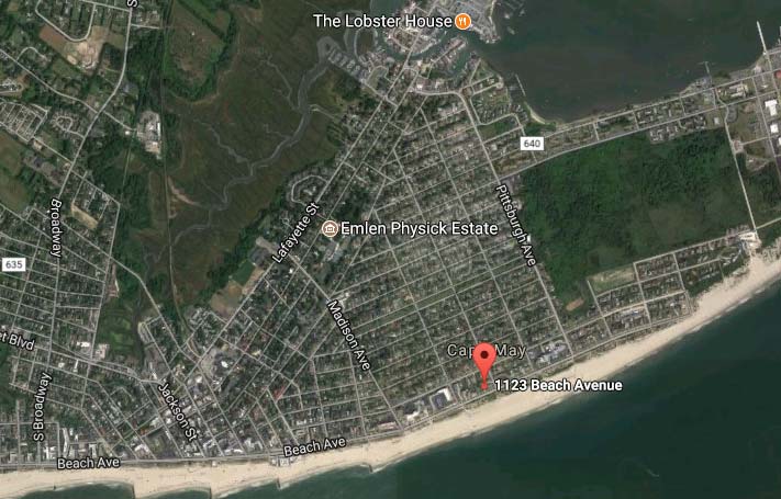 At the end of the Garden State Parkway at mile marker “0”, merge left and go through the traffic lights and over the Cape May Canal bridge into Cape May on Rte 109 South. Rte 109 will become Lafayette Street. At the next light, Madison Avenue, make a left turn and continue to the stop sign at the beach. The cross street is Beach Avenue. Make a left turn onto Beach Avenue, travel approximately one and a half blocks and look for Rhythm of the Sea on your left.