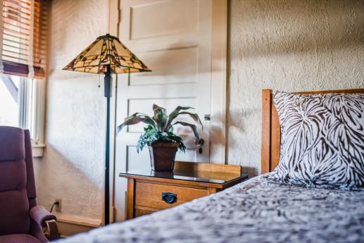 During the Arts and Crafts Movement people believed in the healing powers of sea air and in the days before air conditioning an open air sleeping porch offered a cool summer night’s sleep. This room evokes the invigorating spirit of the tropics with the colorful spectrum of deep coral, fresh greens and sunny palms. View the sparkling water from your bed or recliner and allow the balmy breezes to drift over you and lull you to sleep.